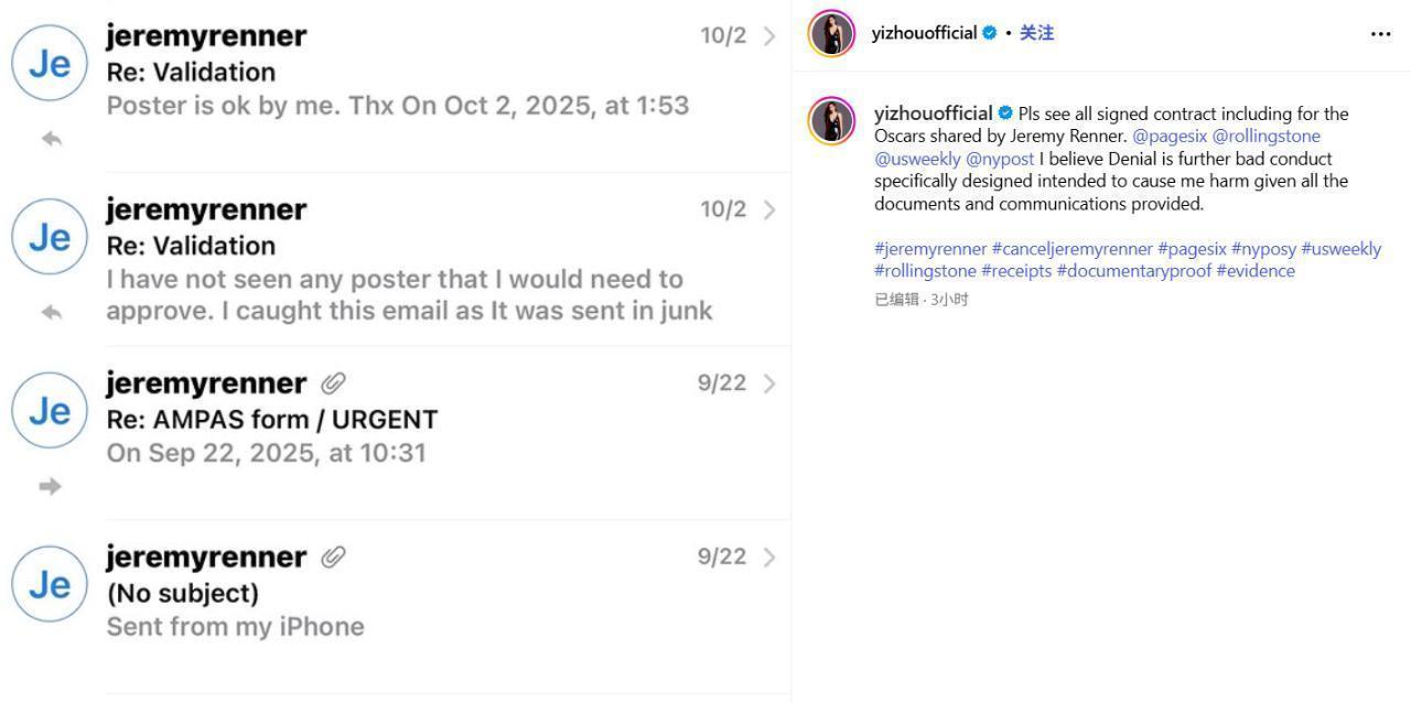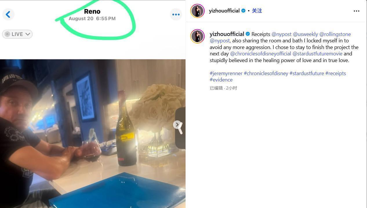 这让她不得不选择曝光一切,上周,周依接受了《每日邮报》的采访。从俩人一开始认识、到杰瑞米·雷纳否认关系,周依将所有细节都披露给了《每日邮报》。还晒出照片和聊天截图为证,称在8月份的一次电影讨论会议上,杰瑞米·雷纳喝醉了酒冲她大吼大叫,变得非常暴力和愤怒。周依晒她在杰瑞米·雷纳家里的照片