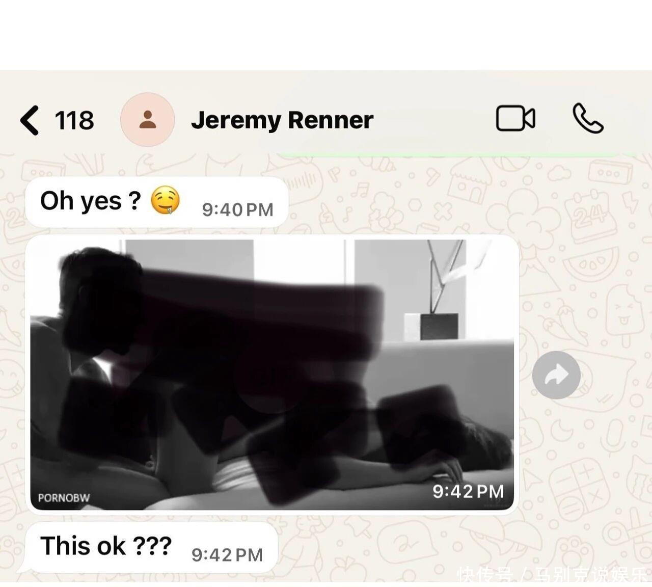 还发送了一段私人的私密照片,以及一段露骨的视频。杰瑞米·雷纳发送给周依的WhatsApp视频(过于露骨已打码)