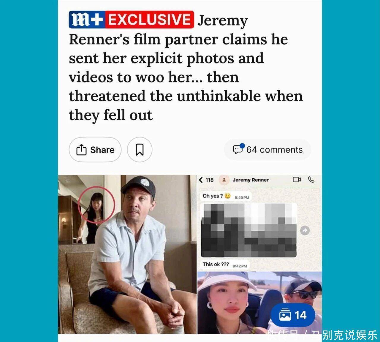 杰瑞米·雷纳遭中国导演曝光:私下发私密照并威胁她